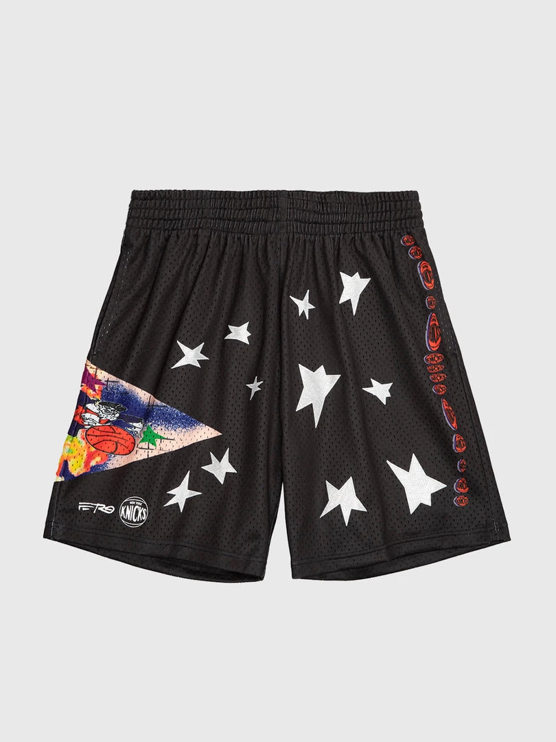 These shorts have a 100% poly mesh body, fully sublimated print, printed metallic graphics, side seam pockets, flat elasticized waistband with adjustable drawstring, embroidered and printed details and a special collaborative woven jocktag.